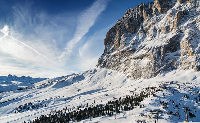 Die Grödner Ortschaft Wolkenstein liegt am Fuße des Sellastocks. Das Skigebiet Wolkenstein ist Teil des Skikarussells Sellaronda.
